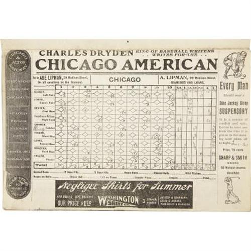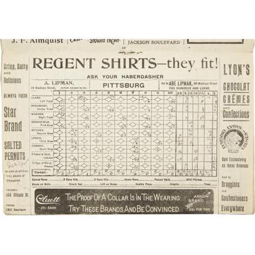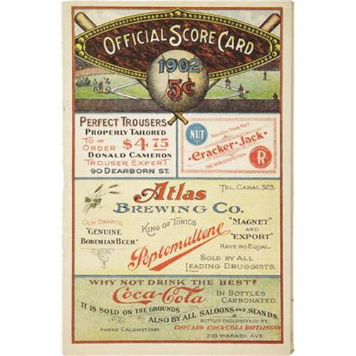 <B>1902 Chicago Orphans vs. Pittsburg Pirates Program.</B></I> Tremendously scarce "Official Score Card" documents a visit by Honus Wagner's National League Championship Pirates to Chicago's West Side Park the year before the club would take on its new "Cubs" moniker. The twenty-page booklet remains in remarkably strong condition, with the pencil marked center score pages listing legends from Tinker to Chance to Fred Clarke. This center spread has loosened from, but still remains affixed to, the center staples, though the booklet remains otherwise tightly bound. All other pages show a remarkable absence of wear. The color lithography on front and rear covers is simply out of this world. Definitely one of the finest from the very short supply of turn-of-the-century scorecards surviving in the hobby today. And, with a record of 103 victories and thirty-six losses, this season marks the highest winning percentage (.741) in Pirates history.<BR><BR><b>Shipping:</b> Flat Material, Small (<a target="_blank" href="http://www.heritageauctions.com/common/shipping.php">view shipping information</a>)