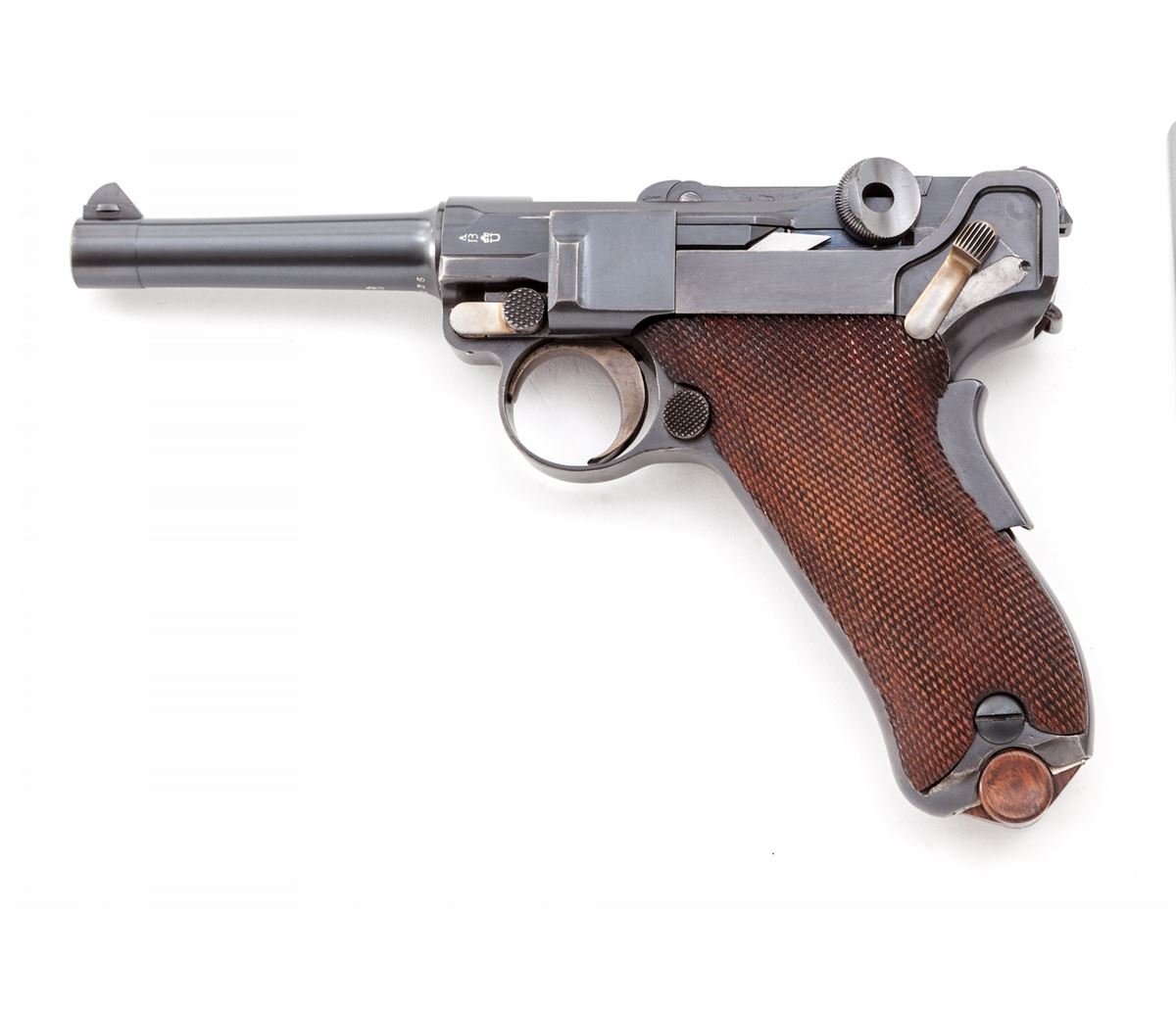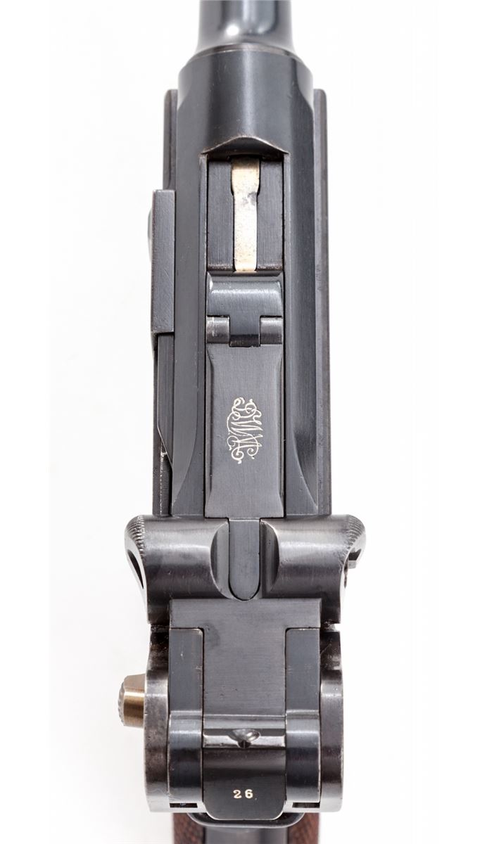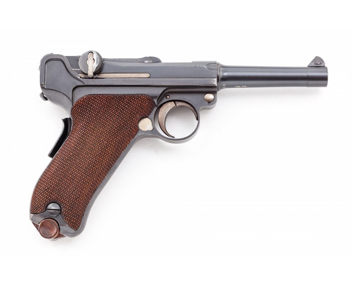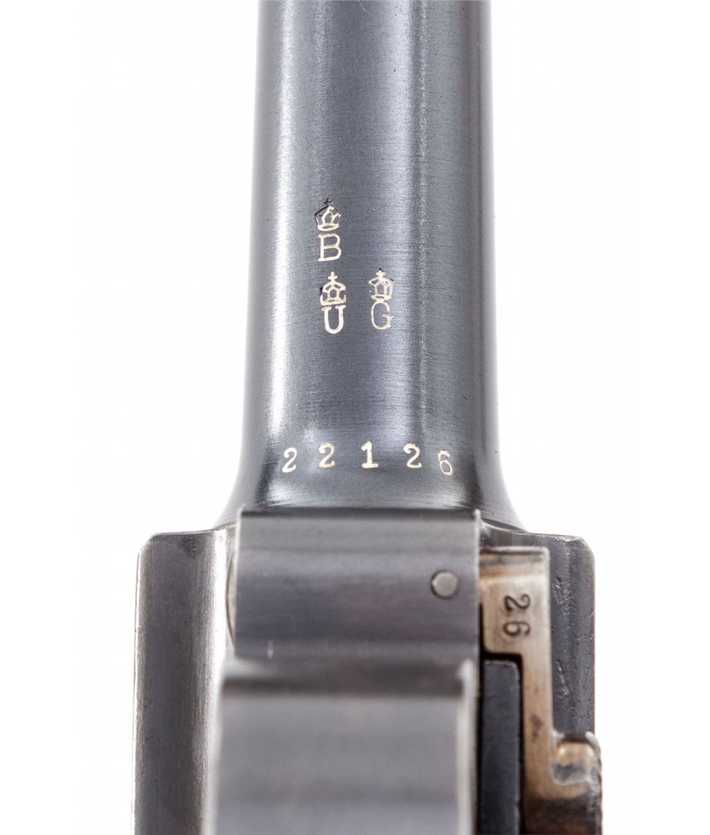 1902 Commercial Fat Barrel Luger, #22126, 9mm, 4'' barrel, blue finish with straw small parts, factory checkered walnut grips, and one nickel-plated magazine with walnut base marked ''CAL 9M/M''. BUG proofmarks to upper receiver and barrel, serrated thumb safety with lower portion polished bright, scalloped toggle knobs and grip safety. This example is not import marked ''Germany'' and was probably made for commercial sales in Europe. Condition is excellent with possible rust blue touchup to front and backstrap. Grips and action are crisp, bore is fine. All visible matching numbers. Est.: $8,000-$12,000. (C&R/PPT) (John Siroonian estate)