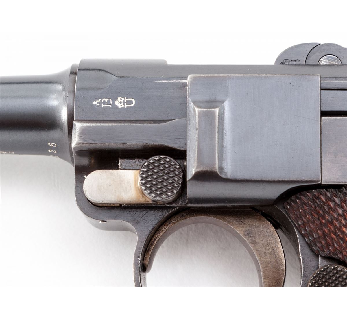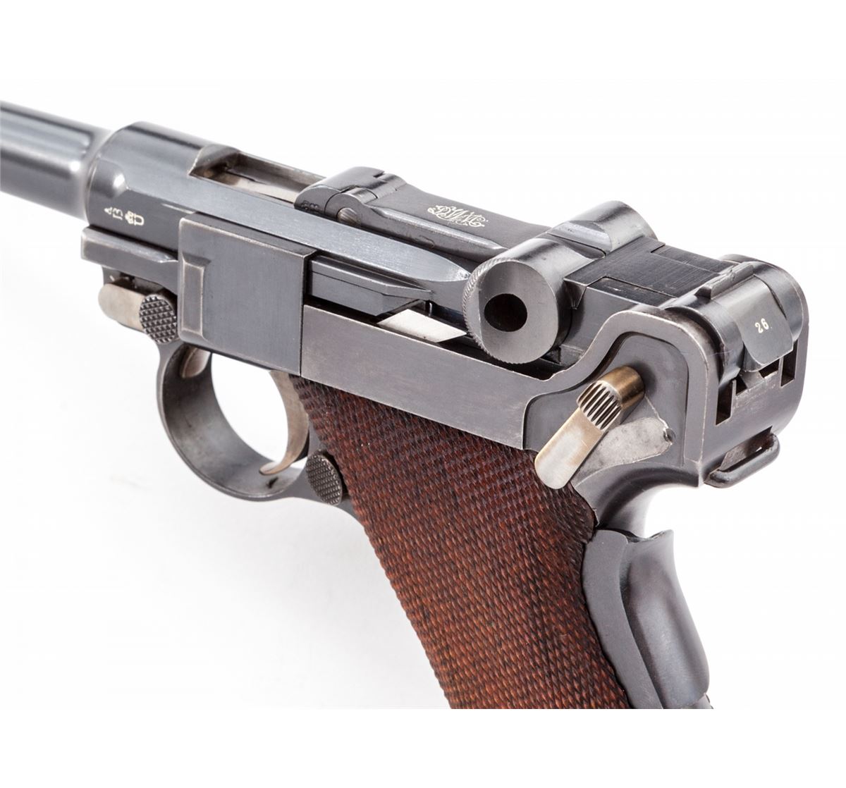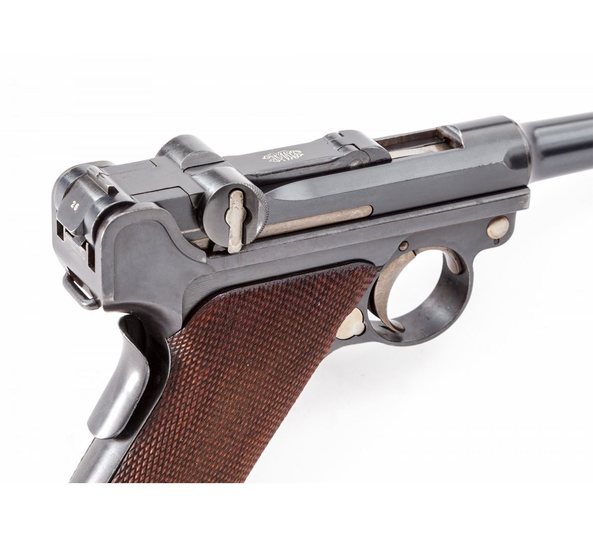 1902 Commercial Fat Barrel Luger, #22126, 9mm, 4'' barrel, blue finish with straw small parts, factory checkered walnut grips, and one nickel-plated magazine with walnut base marked ''CAL 9M/M''. BUG proofmarks to upper receiver and barrel, serrated thumb safety with lower portion polished bright, scalloped toggle knobs and grip safety. This example is not import marked ''Germany'' and was probably made for commercial sales in Europe. Condition is excellent with possible rust blue touchup to front and backstrap. Grips and action are crisp, bore is fine. All visible matching numbers. Est.: $8,000-$12,000. (C&R/PPT) (John Siroonian estate)
