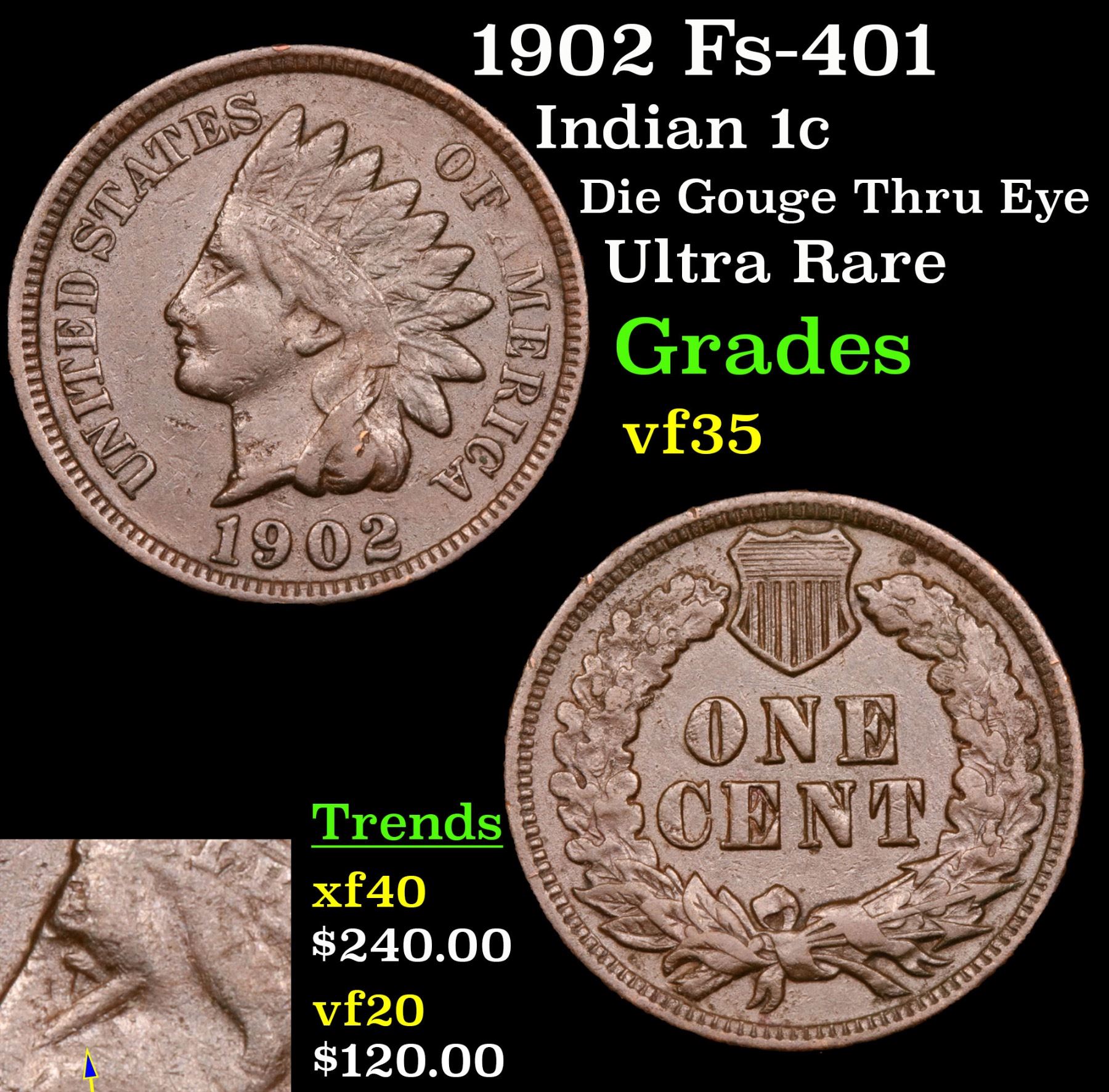 1902 Fs-401 Die Gouge Thru Eye Ultra Rare Indian Cent 1c Grades vf++. A Corey's Pick
