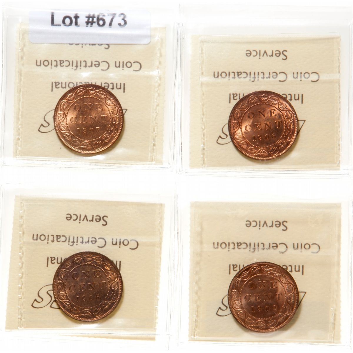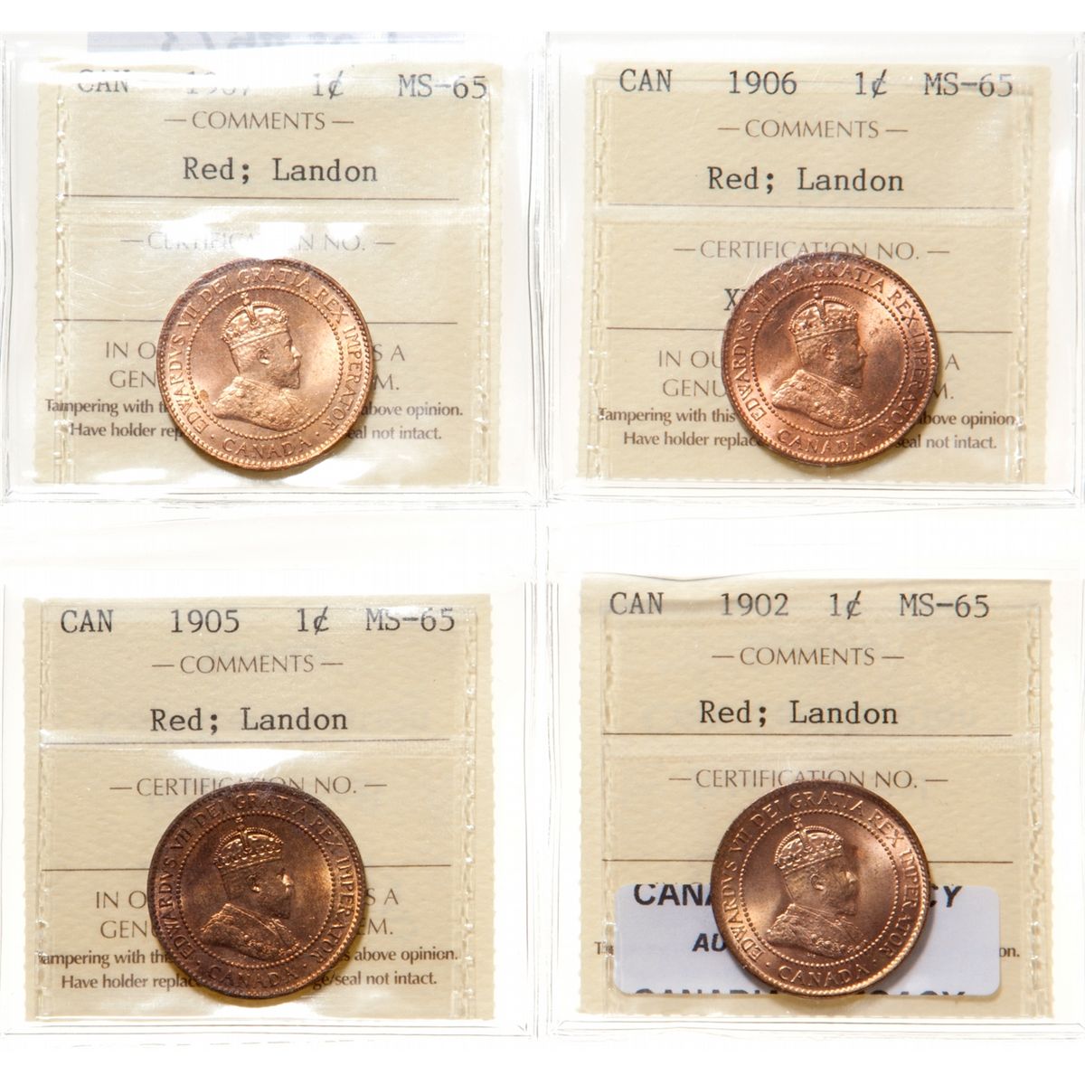 1902. ICCS Mint State-65. Red. 95% even red-orange luster; 1905. ICCS Mint State-65. Red. 85% even red-orange luster; 1906. ICCS Mint State-65. Red. 90% even red-orange luster; 1907. ICCS Mint State-65. Red. 90%+ even red-orange luster. Lot of four (4) Gem large cents.