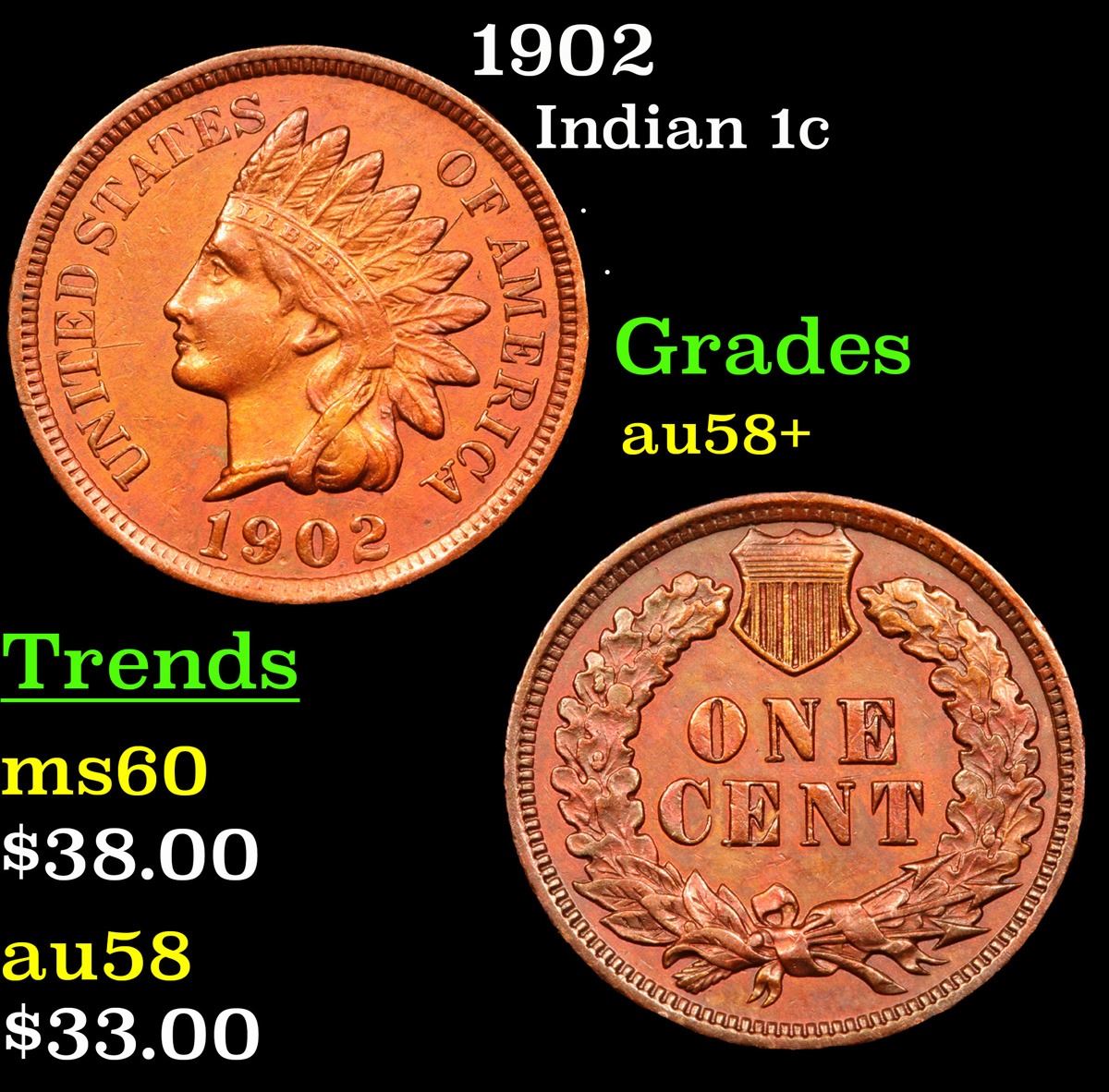 1902 Indian Cent 1c Grades Choice AU/BU Slider+.