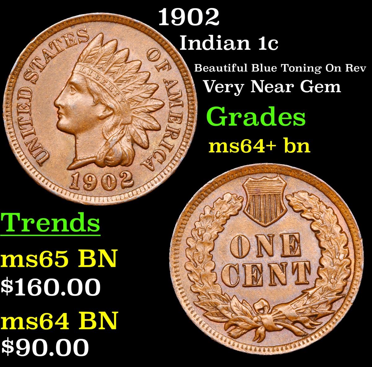 1902 Beautiful Blue Toning On Rev Very Near Gem Indian Cent 1c Grades Choice+ Unc BN.