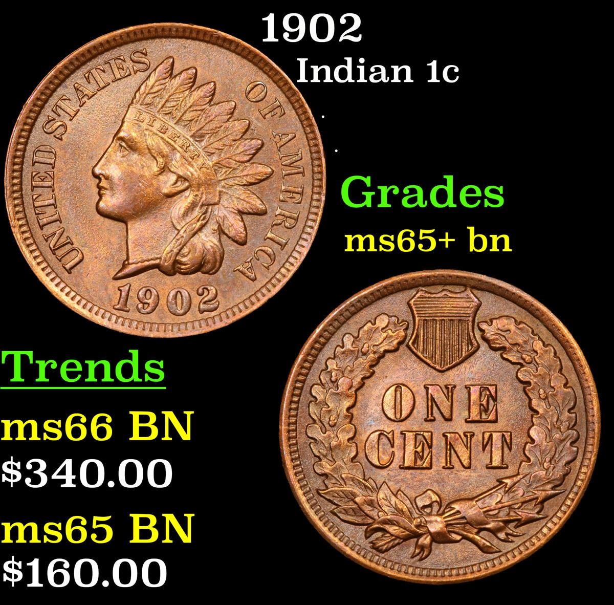 1902 Indian Cent 1c Grades GEM+ Unc BN.