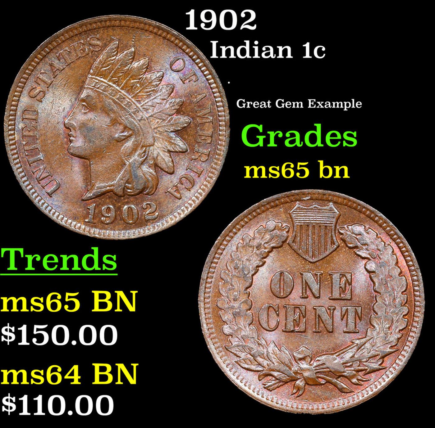 1902 Indian Cent 1c Grades GEM Unc BN.
