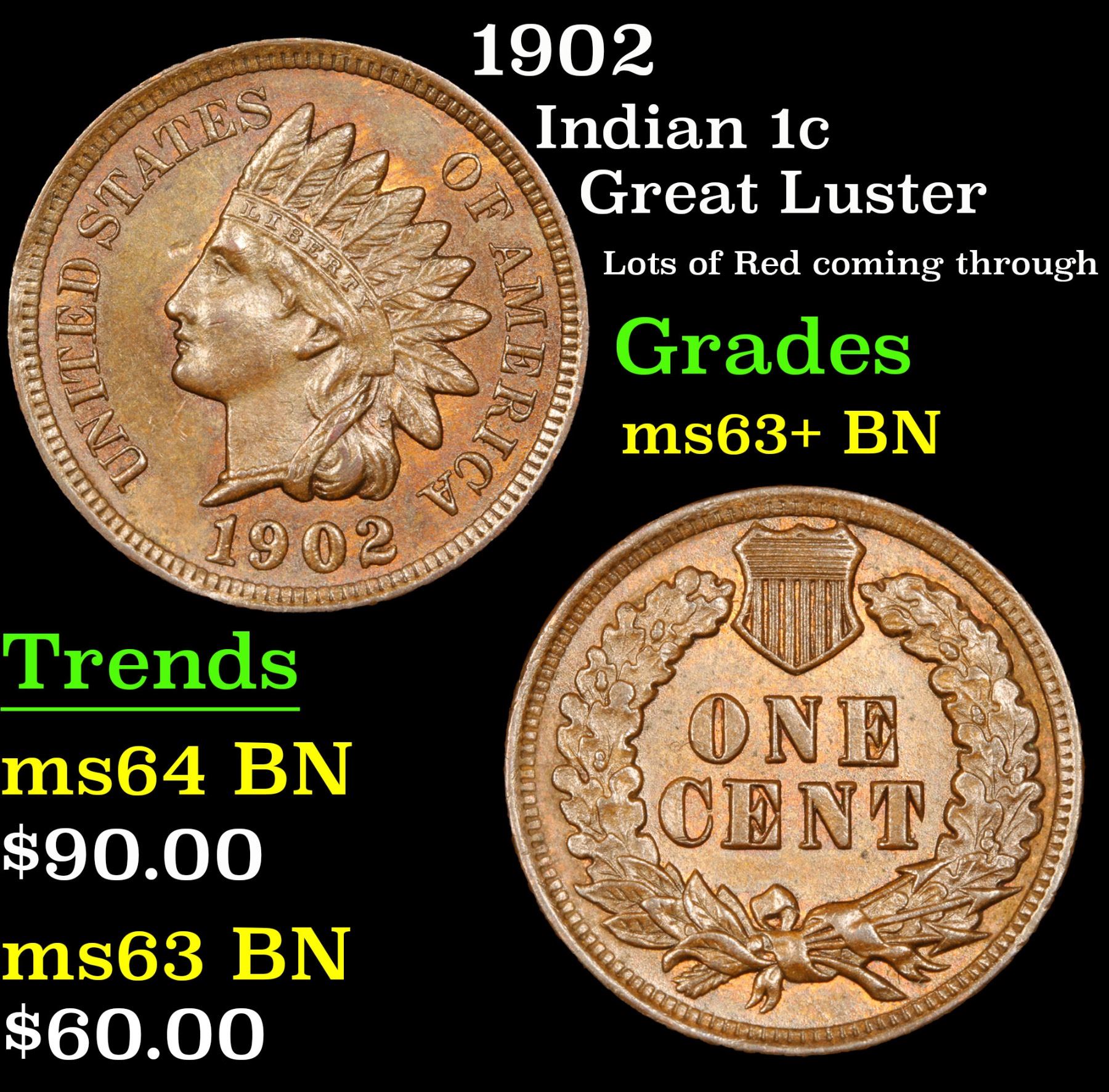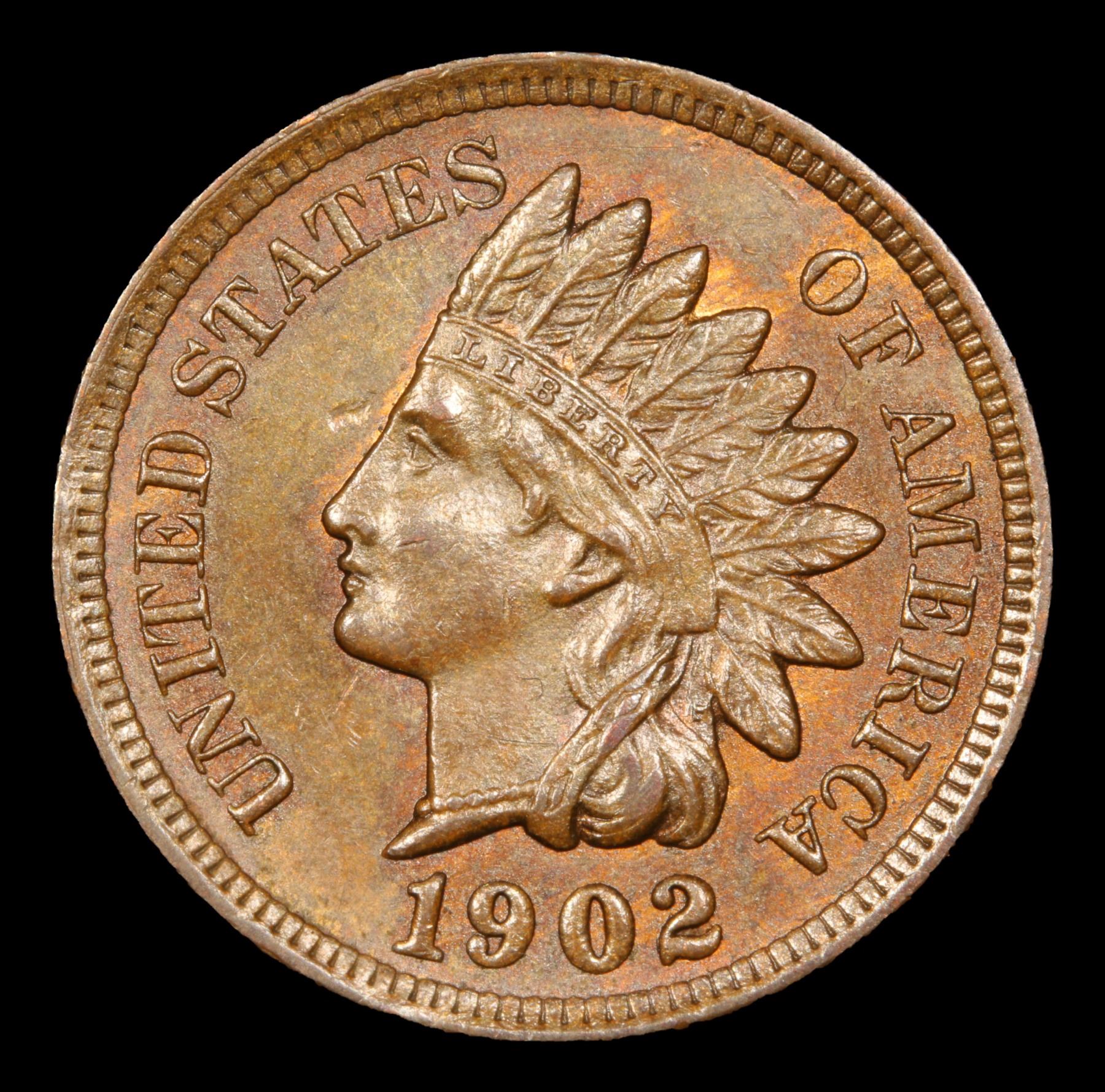 1902 Indian Cent 1c Grades Select+ Unc BN. Great Luster; Lots of Red coming through