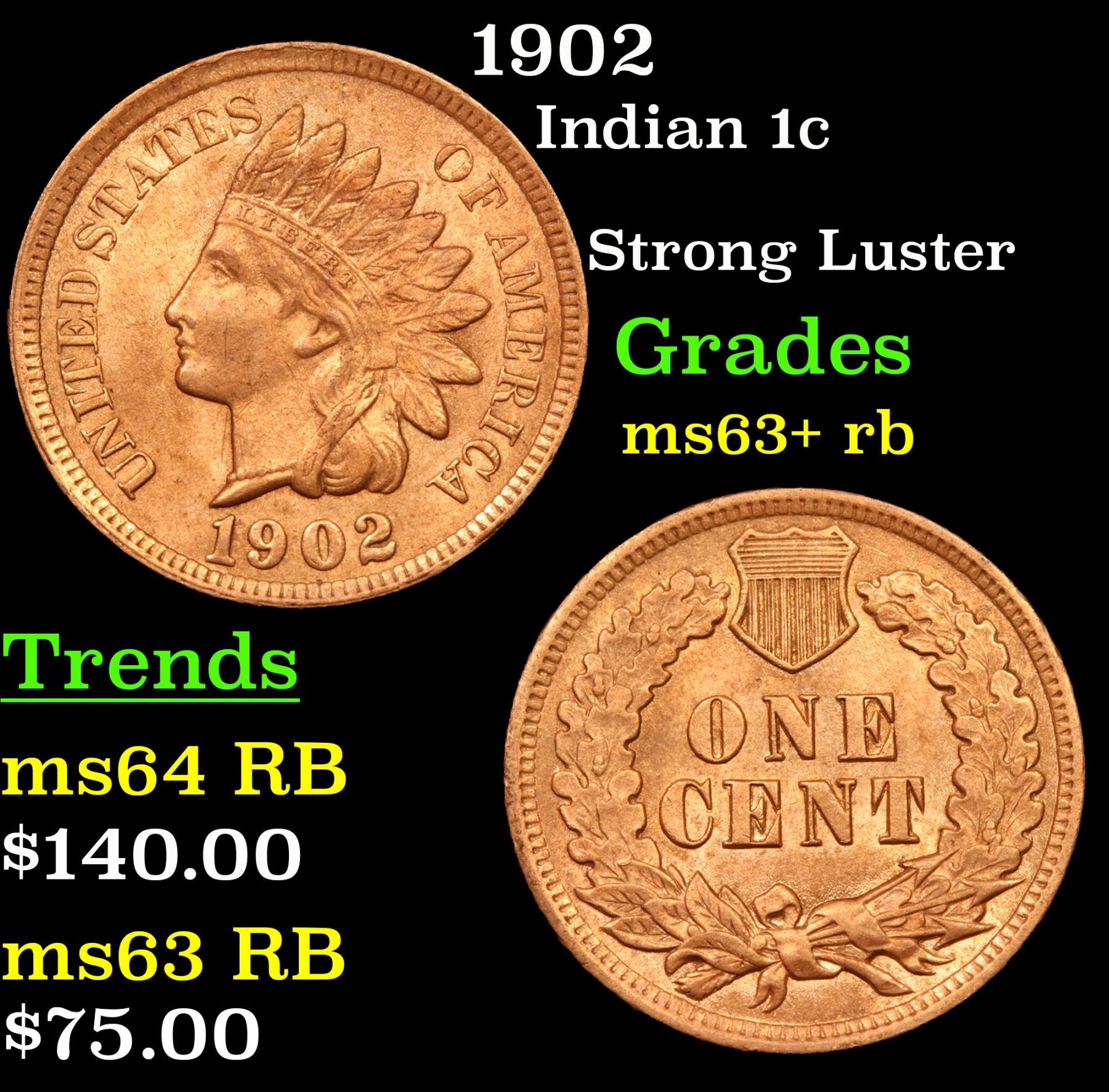 1902 Indian Cent 1c Grades Select+ Unc RB.