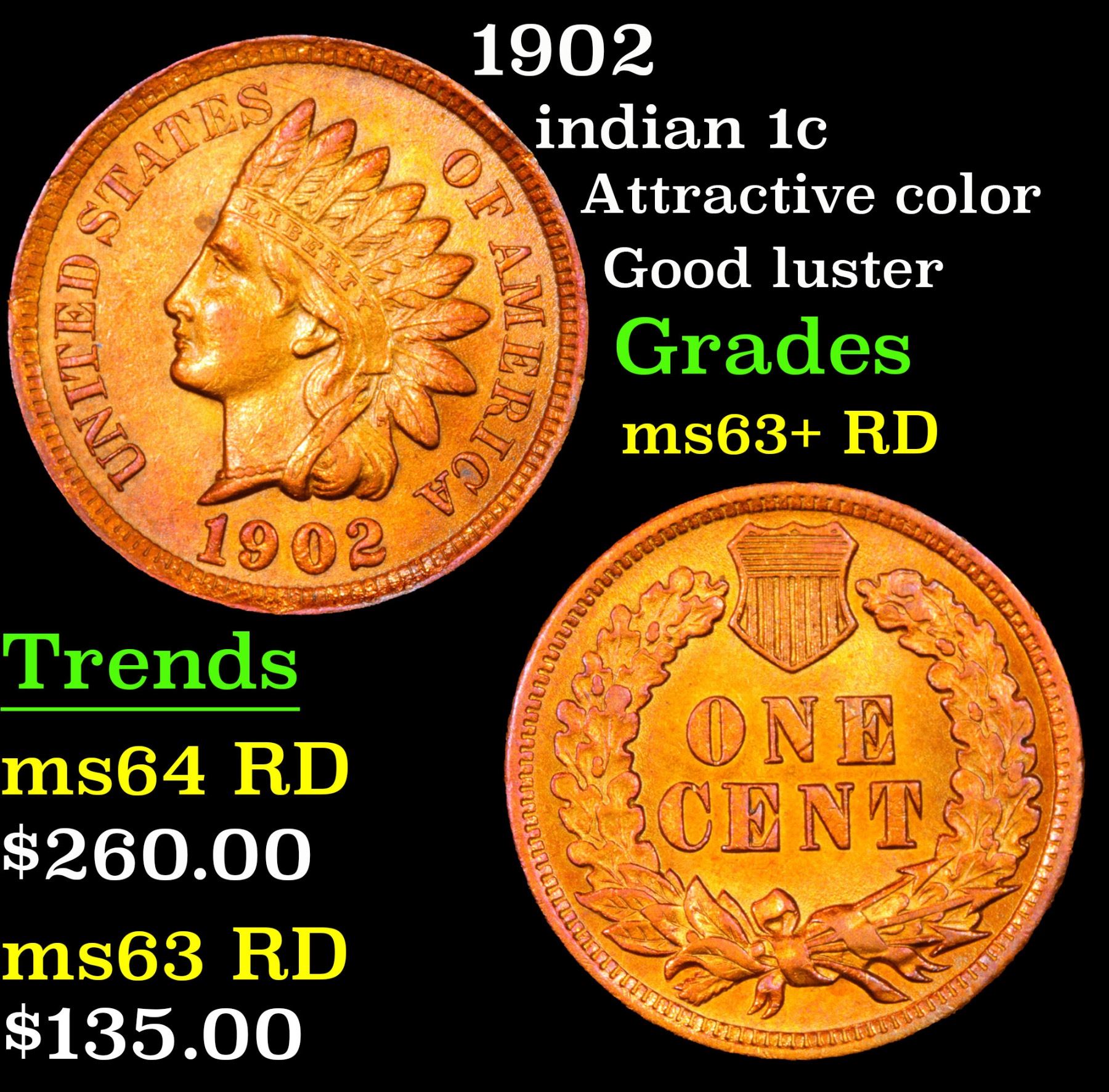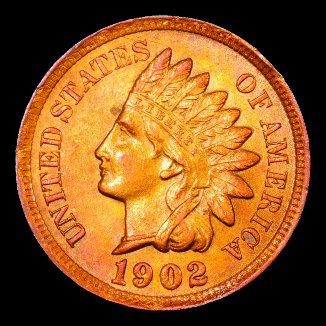 1902 Indian Cent 1c Grades Select+ Unc RD. Attractive color; Good luster