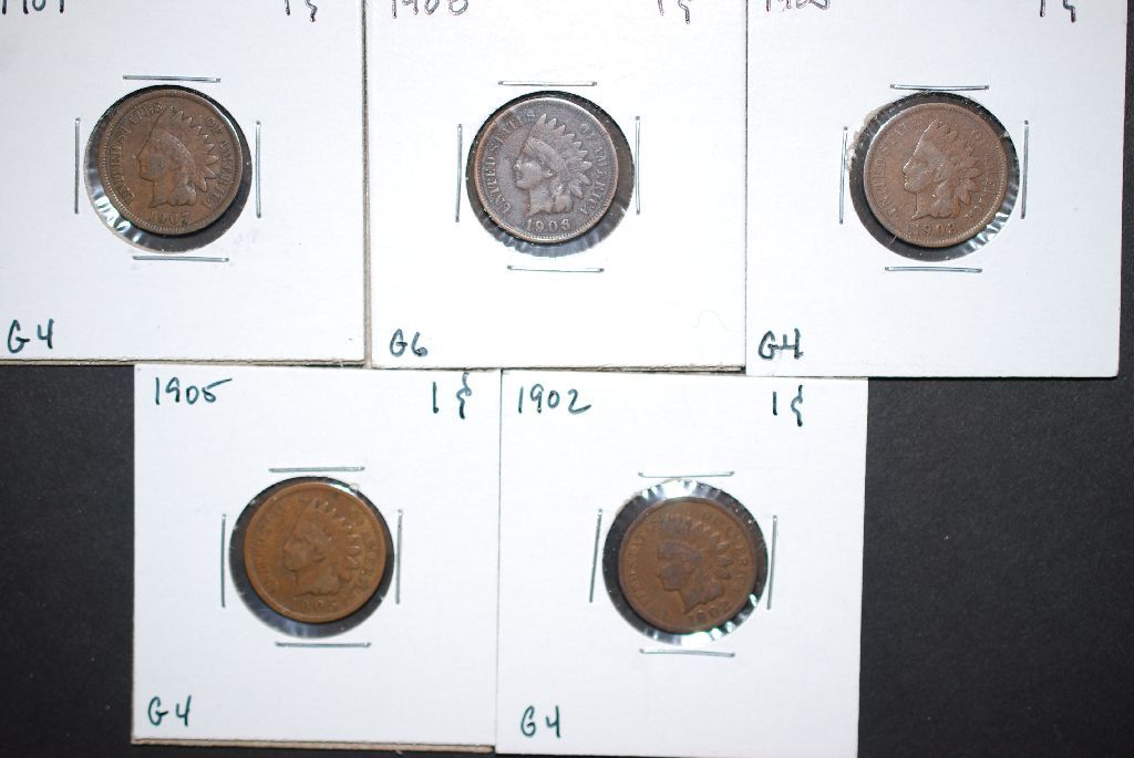 1902 Indian Head One Cent; G4, 1903 Indian Head One Cent; G4, 1905 Indian Head One Cent; G4, 1907 Indian Head One Cent; G4 & 1908 Indian Head One Cent; G6; Lot of 5; EST. $10-15
