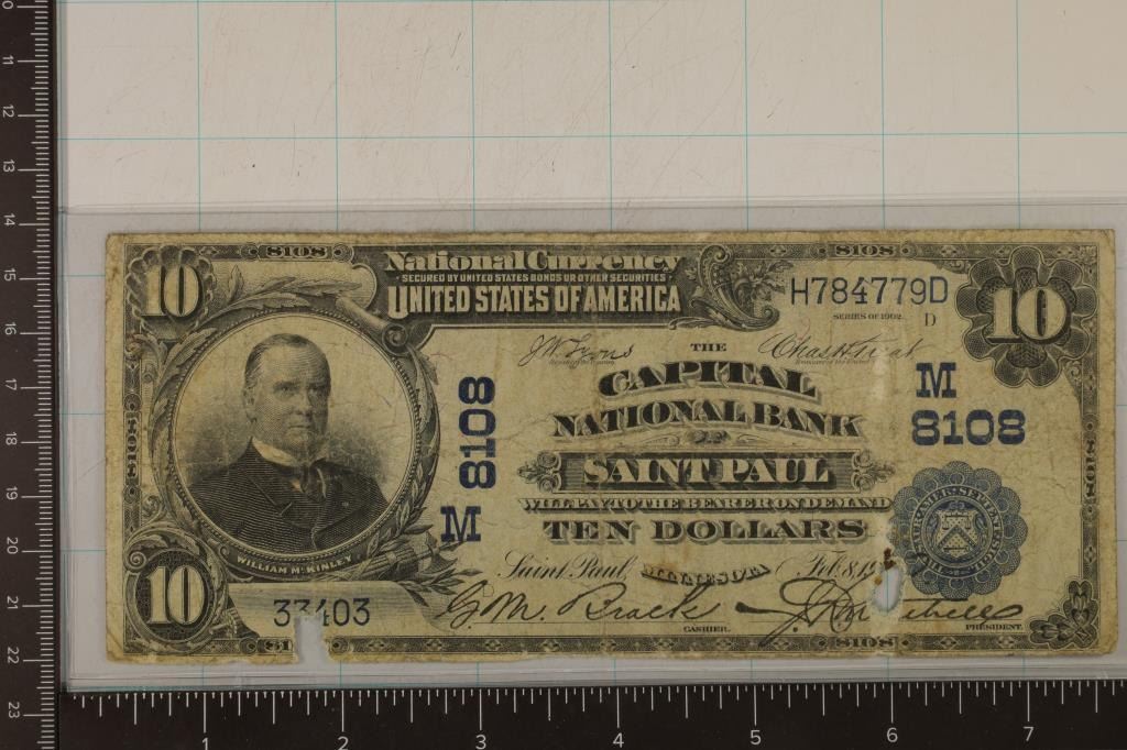 CAPITOL BANK OF SAINT PAUL, MINNESOTA BLUE SEAL HORSE BLANKET BILL. HAS A COUPLE OF HOLES AS SHOWN