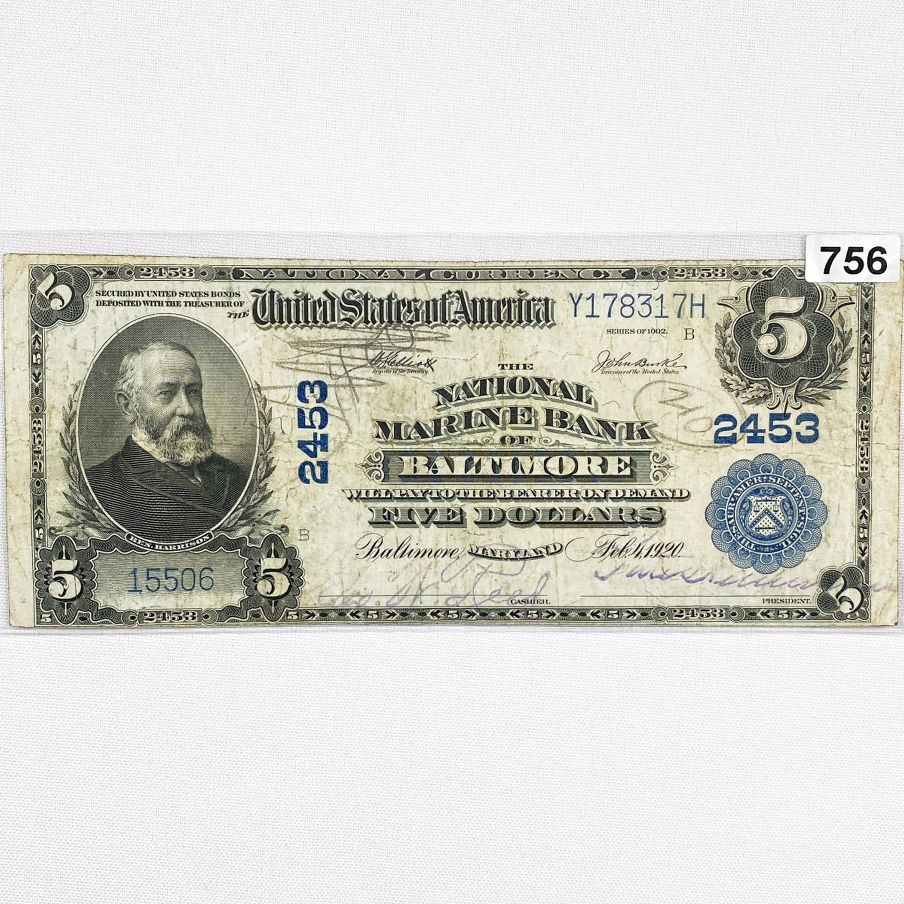 1902 LG $5 Baltimore MD National Bank Note CIRC