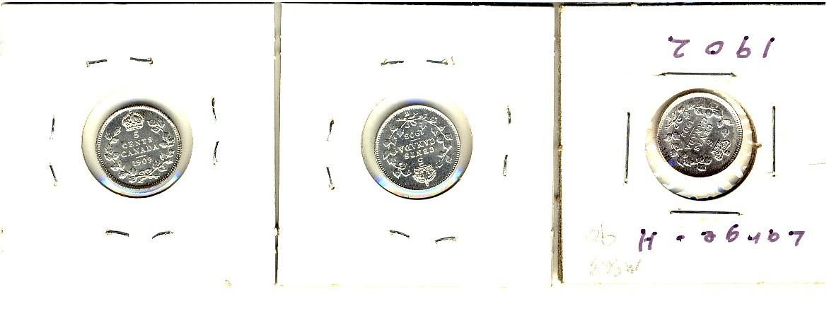 1902 Lg.H, 1903 Sm.H, 1909 RL 5¢, lot of 3 coins. All EF-45 to AU-50 Cleaned.