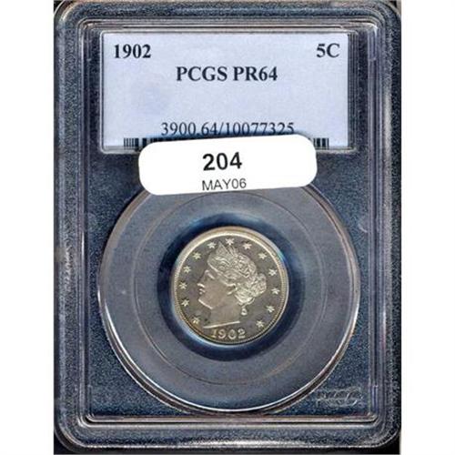 <b>1902 Liberty Nickel. PCGS graded Proof 64.</b> Another sparkling Proof in this choice run of dates, with pleasing mirrors capped off by sharp devices. In fact, this 1902 nickel is nicely struck in all areas including the wreath. Proofs were minted every year that the Liberty nickel was produced. The figure for 1902 came to 2,018 pieces <b>(PCGS # 3900)</b> <i>