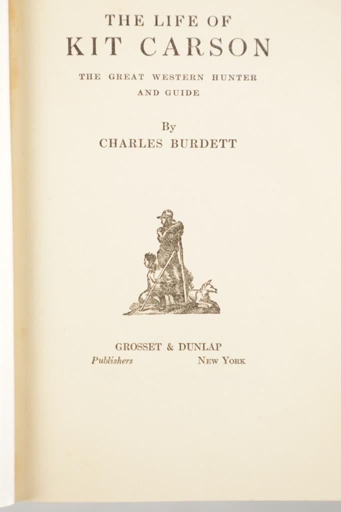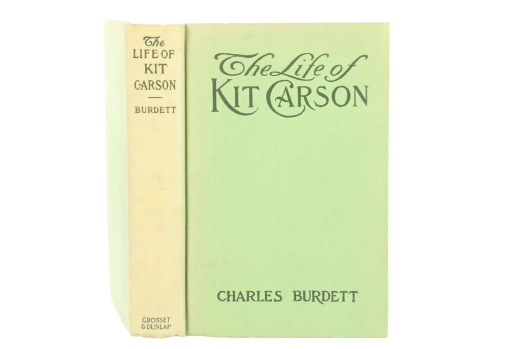 Featured in this lot is this 1902 edition of The Life of Kit Carson: The Great Western Hunter and Guide by Charles Burdett. The book chronicles the life and adventures of Christopher "Kit" Carson as one of the Old West's most famous hunter, guide and scout. Burdett portrays Carson as a classic American folk hero, describing his expeditions westward, his trade ventures, learning to fight from Native American Indians, and his settling in Indian cultures. Other notable topics include Carson's buffalo and bear hunting excursions, accounts of his involvement in John C. Fremont's expeditions, thrilling adventures and hair breadth escapes among the Indians and Mexicans, as well as his daring and invaluable services as a guide and scout. This green cloth bound hardcover is in good overall condition, very slight scuffing observed on cover edges, faded spine colour. Intact pages exhibit age tanning and foxing throughout. No other obvious marring noted. Measures 5.5"W x 8.25"L x 1.25"D