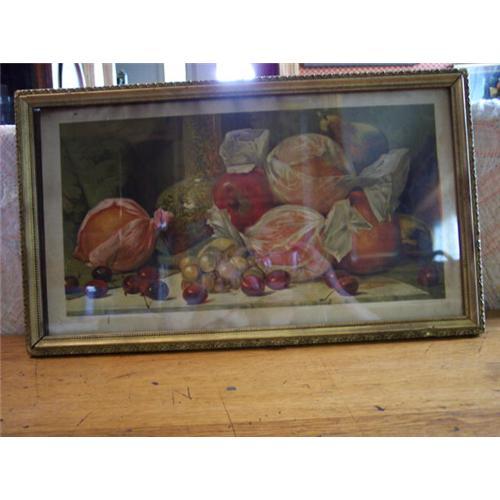 1902 Lithograph by HARRY ROSELAND.He was an American artist from 1868-1950.The colors on this are just wonderful.The left corner says AMERICAN LITHOGRAPHIC CO.NY.The right side corner saysISSUED 1902,BY WOOLSON SPICE CO.In the picture you will se a mark on the top right towards the middle.This is some gold spray paint that has been there for years.On the top left there is what looks like dirty areas on the lithograph,that may come off if taken apart.The bottom right side and areas on the bottom do have what looks like water stain.If this were matted it would not show.I have had a number of fruit prints on my kitchen walls for years and am now re-doing the kitchen so these all have to go for someone else to enjoy.This one measures 19 1/8" across x 11 1/4" tall.That includes the frame.Old wood back.