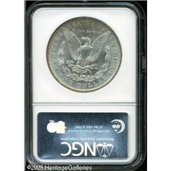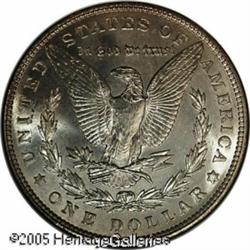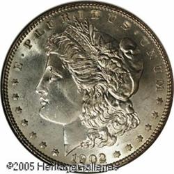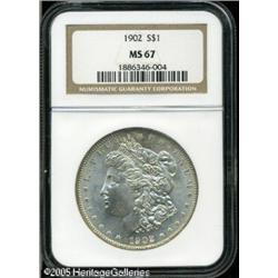 <B>1902<img border='0' src='http://www.heritagecoins.com/images/star.gif' width=10 height=10>$1 MS67 NGC.</B></I> A gorgeous specimen of this date with magnificent surfaces and a touch of light gold toning near the rims. The combined NGC and PCGS population reports show a total of 22 pieces this high with none seen finer by either service. A great coin to put away and long enjoy. Lot:10598