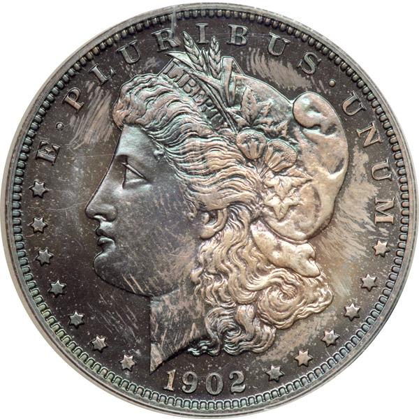 1902 Morgan Dollar. PCGS graded Proof 67. Housed in an Old Green Holder. Lovely toning on both sides. Part of an original Proof set in this sale. Only 777 struck. All-brilliant motifs and highly alluring mirror fields display the toning well superb surfaces. A sharp and evenly struck Gem Proof of the finest order, this beautiful coin literally defies any would-be bidder to locate a surface disturbance. We could buzz on with endless reflection about this ethereal gem, but suffice it to say that if any coin deserves to be "among finest known" Proof of its respective date, then the present 1902 Morgan Dollar is it! Pop 4; 1 finer in 68 (PCGS # 7337) .