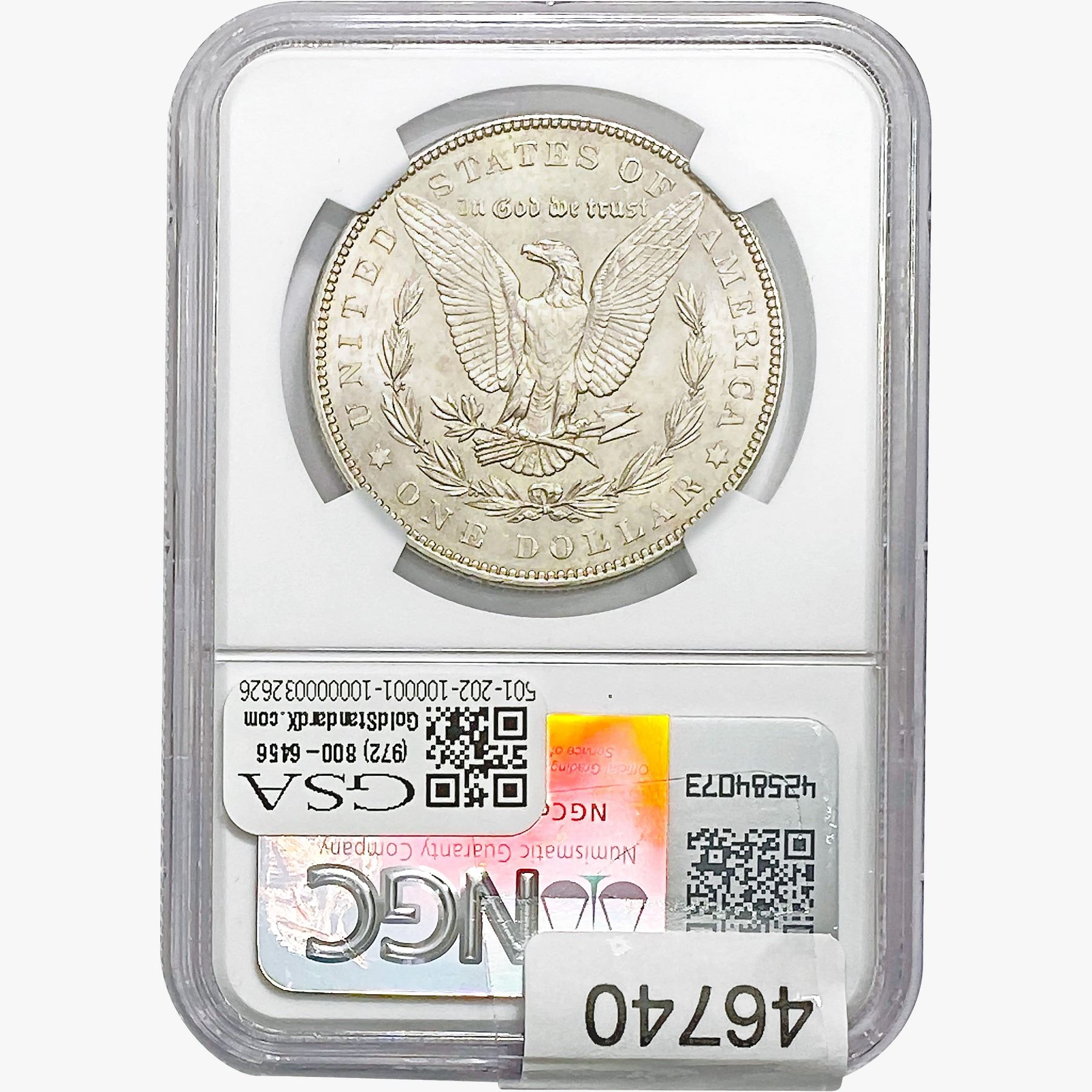 e. Coins sold referencing a third-party grading service are sold “AS IS” without any express or implied warranty, except for a guarantee by GSA that they are genuine. Removal or alteration of the holder, voids all of Bidder’s claims concerning that Product. Certain warranties may be available from the grading services and Bidders are referred to them for further details: Numismatic Guaranty Corporation (NGC), PO Box 4776, Sarasota, FL 34230, www.ngccoin.com/services/writtenguarantee.asp; Professional Coin Grading Services (PCGS), PO Box 9458, Newport Beach, CA 92658, www.pcgs.com/guarantee.html; ANACS, 6555 S. Kenton St., Ste. 303, Englewood, CO 80111; and Independent Coin Grading Co. (ICG), 7901 East Bellview, Ave., Suite 50, Englewood, CO 80111.