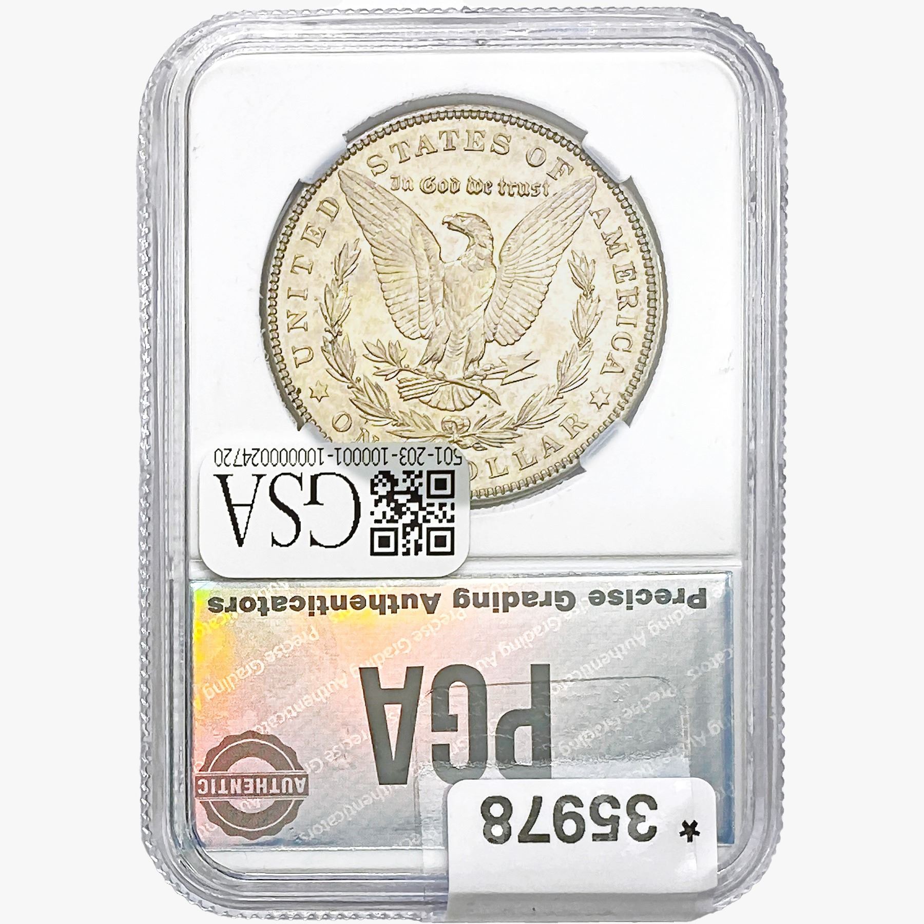 COINS AND CURRENCY LISTED IN GSA’S CATALOG AS GRADED AND ENCAPSULATED BY PCGS, NGC, ANACS, ICG, PCGS CURRENCY, PMG, PCGS BANKNOTE GRADING, CMC OR ANY OTHER THIRD-PARTY GRADING SERVICE ARE LIKEWISE SOLD “AS-IS” EXCEPT AS EXPRESSLY SET FORTH HEREIN. ALL THIRD-PARTY GRADING SERVICE GUARANTEES, INCLUDING AUTHENTICITY, ARE THE SOLE RESPONSIBILITY OF THE THIRD-PARTY GRADING SERVICE AND NOT WARRANTIES OR GUARANTEES OF GSA. BIDDERS SHOULD CONTACT THESE THIRD-PARTY GRADING SERVICES DIRECTLY WITH RESPECT TO ANY CLAIMS OR QUESTIONS THEY MAY HAVE CONCERNING THEIR GUARANTEES AND WARRANTIES. BIDDERS ACKNOWLEDGE AND AGREE THAT AUCTIONEER IS NOT BOUND BY OR LIABLE FOR ANY OPINION OR CERTIFICATION BY ANY THIRD-PARTY GRADING SERVICE. REMOVAL OF A PRODUCT FROM ITS PROTECTIVE CASING OR HOLDER OR ALTERATION OF ANY COIN HOLDER WAIVES ALL RIGHTS CONCERNING THE PRODUCT CONTAINED THEREIN.