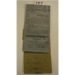 NC & St. L Railway ticket dated April 18, 1902 (Nashville, Chattanooga and St. Louis). Purchased by E.V. Horton from Fayetteville, TN to Dallas, TX. and return to travel to the United Confederate Veterans Reunion. Stub is punched with special "Agents Certificate". Condition: Good, folded.