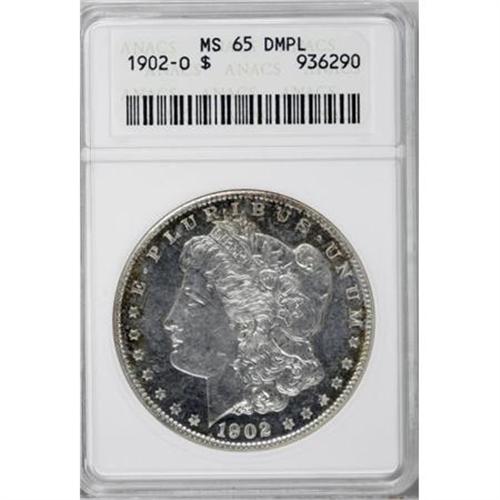 <B>1902-O $1 MS65 Deep Mirror Prooflike ANACS.</B></I> This is an exceptional representative of this New Orleans issue in that the design features are better struck than normally seen. Bright, lustrous surfaces are visited by occasional whispers of cobalt-blue, lavender, and golden-tan color at the peripheries. A few grade-consistent ticks are noted on the obverse.<BR><BR><b>Shipping:</b> Coins & Currency (<a target="_blank" href="http://www.heritageauctions.com/common/shipping.php">view shipping information</a>)