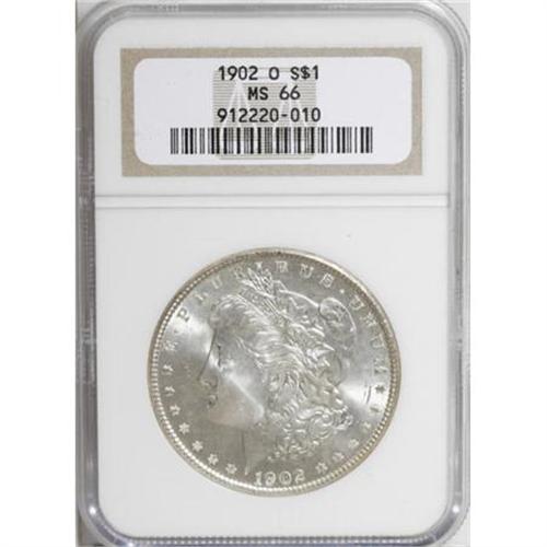 <B>1902-O $1 MS66 NGC.</B></I> Frosty surfaces yield occasional wisps of light tan color under magnification. Well struck, with just a few grade-consistent marks and grazes.<BR><I>From The Silver Spur Collection of Morgan Dollars.</B></I><BR><BR><B>Coin Engraver:</B> George T. Morgan<BR><BR><b>Shipping:</b> Coins & Currency (<a target="_blank" href="http://www.heritageauctions.com/common/shipping.php">view shipping information</a>)