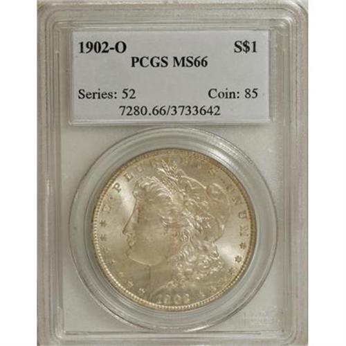 <B>1902-O $1 MS66 PCGS.</B></I> PCGS Population (402/6). NGC Census: (408/19). Mintage: 8,636,000. Numismedia Wsl. Price for NGC/PCGS coin in MS66: $510. (#7280)<BR><BR><B>Coin Engraver:</B> George T. Morgan<BR><BR><b>Shipping:</b> Coins & Currency (<a target="_blank" href="http://www.heritageauctions.com/common/shipping.php">view shipping information</a>)