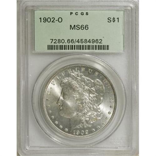 <B>1902-O $1 MS66 PCGS.</B></I> Light tan and powder-blue toning. Potent luster and a nice strike confirm the eye appeal of this charming Premium Gem. The fields are nearly immaculate, and the face has only trivial contact. Housed in a green label holder. PCGS has certified a mere six pieces finer (1/08).<BR><BR><B>Coin Engraver:</B> George T. Morgan<BR><BR><b>Shipping:</b> Coins & Currency (<a target="_blank" href="http://www.heritageauctions.com/common/shipping.php">view shipping information</a>)