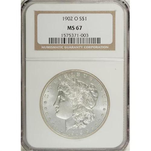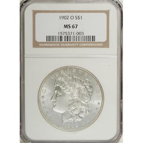 <B>1902-O $1 MS67 NGC.</B></I> An exquisite strike and impressively clean surfaces ensure the high grade of this shimmering and virtually brilliant Superb Gem. Morgan dollars with such formidable quality are typically S-mints struck between 1878 and 1882. New Orleans issued large quantities of silver dollars, and many have survived in Mint State, but those that compare with the quality of the present coin are few and far between. Census: 19 in 67, 0 finer (6/07).<BR><BR><b>Shipping:</b> Coins & Currency (<a target="_blank" href="http://www.heritageauctions.com/common/shipping.php">view shipping information</a>)