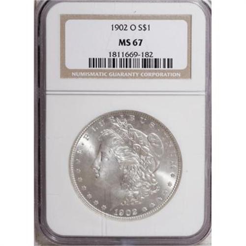 <B>1902-O $1 MS67 NGC.</B></I> In discussing the 1902-O dollar, David Bowers (2005) cites Wayne Miller who wrote in 1982 that the issue is: "Typically among the poorest struck of the late New Orleans dollars. Most are flatly struck with horrible luster." Not so the Superb Gem we present in this lot! Essentially untoned surfaces yield dazzling luster and sharply struck design elements. While minor softness is noted in the hair at Liberty's ear, the eagle's breast feathers are well brought up. There are no mentionable marks to report. Census: 19 in 67, 0 finer (6/07).<BR><I>From the Reuben Reinstein Collection.</B></I><BR><BR><b>Shipping:</b> Coins & Currency (<a target="_blank" href="http://www.heritageauctions.com/common/shipping.php">view shipping information</a>)