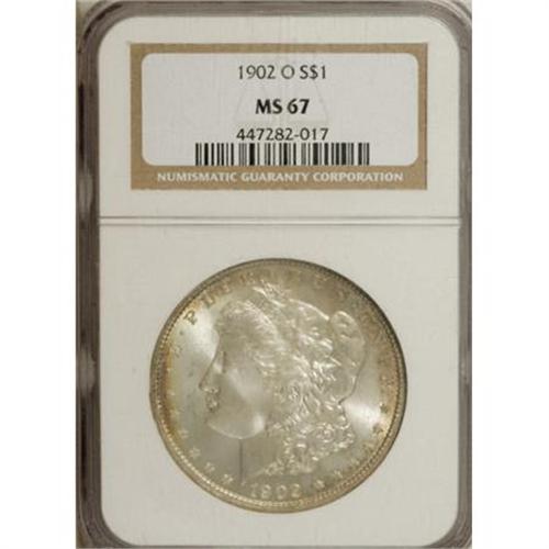 <B>1902-O $1 MS67 NGC.</B></I> A satiny, silky-smooth Superb Gem, with attractive golden-orange iridescent toning along the borders. The strike is slightly deficient at the central design points, hardly an unusual trait for this late-date New Orleans issue. Census: 19 in 67, 0 finer (7/07).<BR><BR><B>Coin Engraver:</B> George T. Morgan<BR><BR><b>Shipping:</b> Coins & Currency (<a target="_blank" href="http://www.heritageauctions.com/common/shipping.php">view shipping information</a>\)
