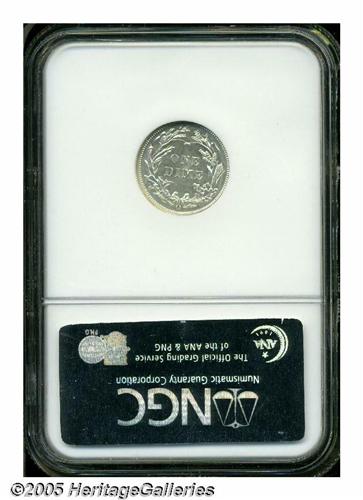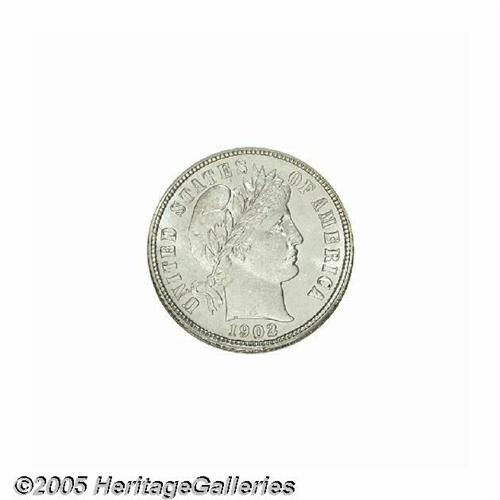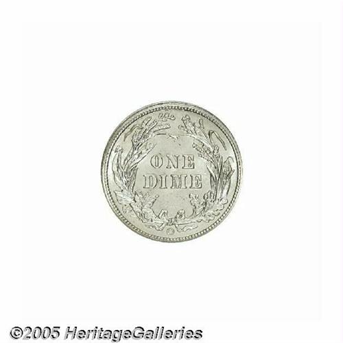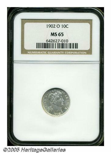 <B>1902-O<10C> MS65 NGC.</B></I> The '02-O is a very scarce issue that is much more difficult than its mintage of 4.5 million would suggest. It is elusive in all Mint State grades and especially challenging in Gem or better condition; NGC and PCGS combined have seen only 10 MS65s, and five pieces grading higher (6/05). The present coin is essentially brilliant with frosty-white luster, and every feature is quite sharp for a product of this branch mint. A few microscopic detractions are noted on Liberty's cheek as the coin is turned under a light.