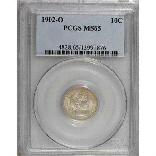 <B>1902-O 10C MS65 PCGS.</B></I> This Gem Barber dime is well struck and lustrous, with a pleasing satiny appearance and creamy-colored surfaces that show a bit of coral toning along the upper obverse periphery. A shallow mark across Liberty's cheekbone prevents an even finer grade assessment. Population: 5 in 65, 2 finer (8/07). <BR><BR><B>Coin Engraver:</B> Charles E. Barber<BR><BR><b>Shipping:</b> Coins & Currency (<a target="_blank" href="http://www.heritageauctions.com/common/shipping.php">view shipping information</a>)