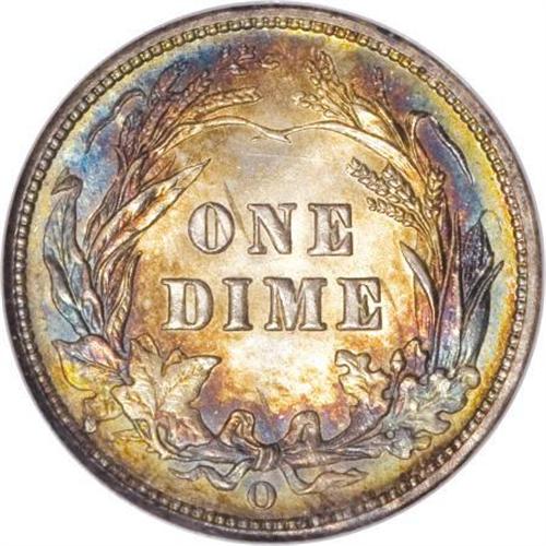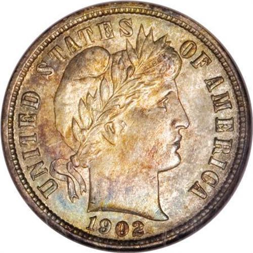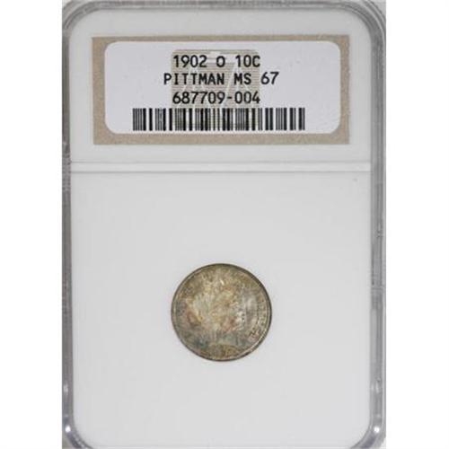 <B>1902-O 10C MS67 NGC.</B></I> Ex: Pittman Collection: The 1902-O Barber dime is a very scarce issue that is much more difficult to locate than its mintage of 4.5 million pieces would suggest. It is elusive in all Mint State grades and especially challenging in Gem or better condition; NGC and PCGS combined have seen only nine MS65s and five MS66 pieces (6/07). <BR> The Superb Gem we offer in this lot is the only one so graded by either service, neither of which have seen a finer 1902-O. Lustrous surfaces see splashes of gray-blue, lavender, cobalt-blue, and golden-tan distributed over the obverse, and cobalt-blue, lavender, and golden-tan patination around the reverse borders. A powerful strike emboldens the design elements, and just a couple of trivial marks are noted on the obverse. A fabulous coin with an impressive pedigree!<BR><I>Ex: John Jay Pittman Collection (David Akers, 10/97), lot 702, which realized $5,225.</B></I><BR><I>From The Belle Glade Collection, Part Two.</B></I><BR><BR><B>Coin Engraver:</B> Charles E. Barber<BR><BR><b>Shipping:</b> Coins & Currency (<a target="_blank" href="http://www.heritageauctions.com/common/shipping.php">view shipping information</a>\)