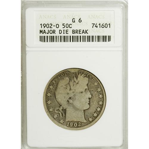 <B>1902-O 50C Half Dollar--Major Die Break--G6 ANACS.</B></I> NGC Census: (0/97). PCGS Population (0/64). Mintage: 2,526,000. Numismedia Wsl. Price for NGC/PCGS coin in G6 : $12. (#6493)<BR><BR><b>Shipping:</b> Coins & Currency (<a target="_blank" href="http://www.heritageauctions.com/common/shipping.php">view shipping information</a>)