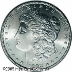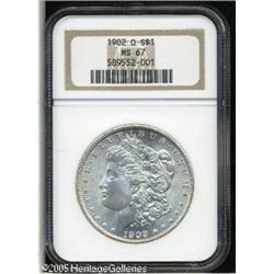 <B>1902-O<img border='0' src='http://www.heritagecoins.com/images/star.gif' width=10 height=10>$1 MS67 NGC.</B></I> Satiny with an untoned appearance, the fully lustrous surfaces easily uphold the MS67 designation. Neither the obverse nor the reverse exhibit a single abrasion that is worthy of mention, Liberty's cheek being particularly smooth in most areas. The overall sharp strike is far superior to that often encountered on survivors of this 20th century O-mint silver dollar. A condition rarity at the Superb Gem level, the '02-O has a certified population of just 17 MS67 examples at NGC (including the <img border='0' src='http://www.heritagecoins.com/images/star.gif' width=10 height=10> designation) with none finer (1/05).<BR><I>From The Banks Collection.</B></I> Lot:10600