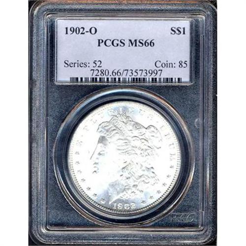 <b>1902-O Morgan Dollar. PCGS graded MS66.</b> This is a pleasing, highly lustrous coin with a few grade-limiting luster grazes but all in all near pristine perfection in its vivid silvery whiteness. Faithful to every detail from a full blow by the dies <b>(PCGS # 7280)</b>
