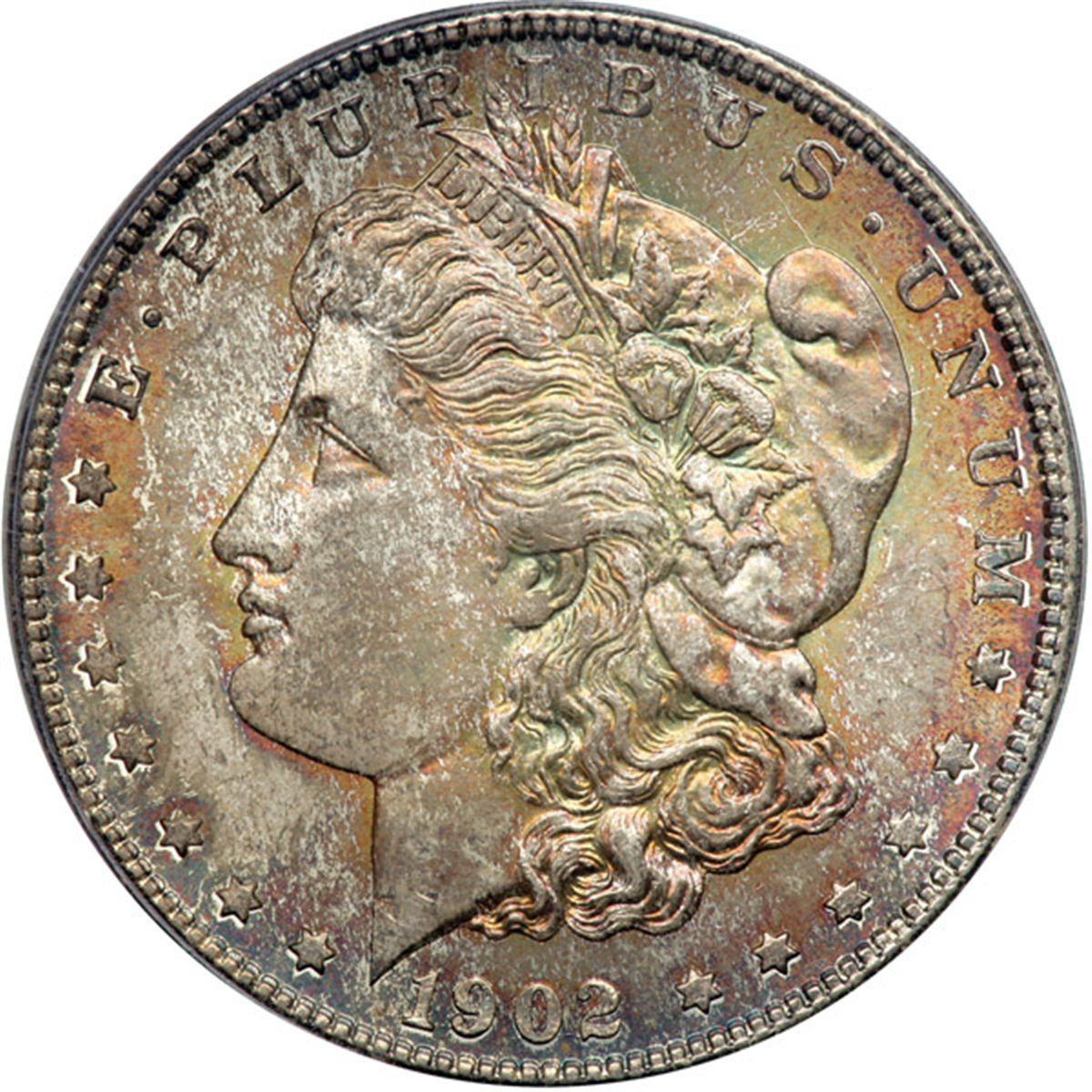 1902-O Morgan Dollar. PCGS graded MS-66. Beautiful multi-color toning on both sides. Pop 459; 12 finer (PCGS # 7280) .