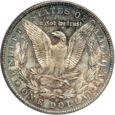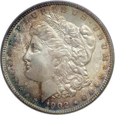 1902-O Morgan Dollar. PCGS graded MS-66. Touches of gold and blue toning rests about the frosty surfaces on both sides. A coin bursting with lustrous afterglow beneath the color and the surfaces are clear of marks (PCGS # 7280) .