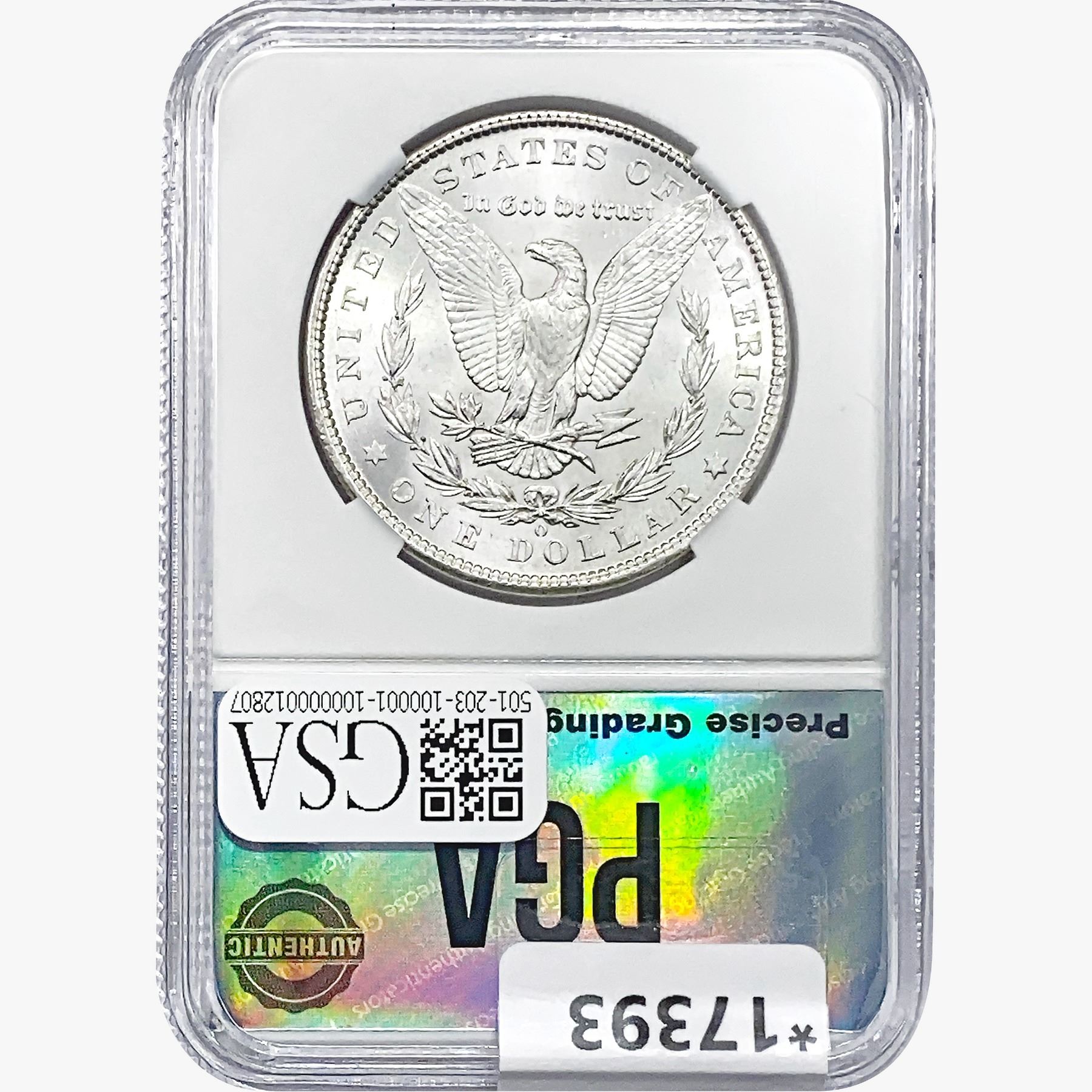 COINS AND CURRENCY LISTED IN GSA’S CATALOG AS GRADED AND ENCAPSULATED BY PCGS, NGC, ANACS, ICG, PCGS CURRENCY, PMG, PCGS BANKNOTE GRADING, CMC OR ANY OTHER THIRD-PARTY GRADING SERVICE ARE LIKEWISE SOLD “AS-IS” EXCEPT AS EXPRESSLY SET FORTH HEREIN. ALL THIRD-PARTY GRADING SERVICE GUARANTEES, INCLUDING AUTHENTICITY, ARE THE SOLE RESPONSIBILITY OF THE THIRD-PARTY GRADING SERVICE AND NOT WARRANTIES OR GUARANTEES OF GSA. BIDDERS SHOULD CONTACT THESE THIRD-PARTY GRADING SERVICES DIRECTLY WITH RESPECT TO ANY CLAIMS OR QUESTIONS THEY MAY HAVE CONCERNING THEIR GUARANTEES AND WARRANTIES. BIDDERS ACKNOWLEDGE AND AGREE THAT AUCTIONEER IS NOT BOUND BY OR LIABLE FOR ANY OPINION OR CERTIFICATION BY ANY THIRD-PARTY GRADING SERVICE. REMOVAL OF A PRODUCT FROM ITS PROTECTIVE CASING OR HOLDER OR ALTERATION OF ANY COIN HOLDER WAIVES ALL RIGHTS CONCERNING THE PRODUCT CONTAINED THEREIN.