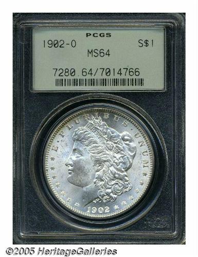 <B>1902-O<S$1> MS64 PCGS.</B></I> Traces of light gold color gravitate to portions of the border on this O-mint specimen. The surfaces exhibit radiant luster and better than average strike definition for the issue. Only the hair above Liberty's ear is weak, which is common for the date. Some miniscule marks on Liberty's cheek and neck limit the grade.<BR><I>From The Milwaukee Shore Collection.</B></I>
