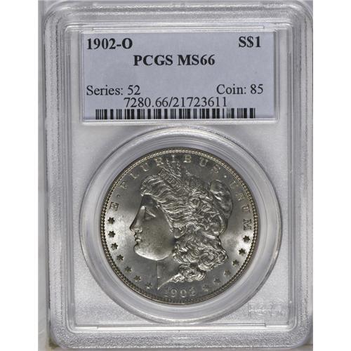 <B>1902-O<img border='0' src='http://www.heritagecoins.com/images/star.gif' width=10 height=10>$1> MS66 PCGS.</B></I> Comparatively well struck for a non-prooflike coin of this issue. This piece has attractive luster with slight, hazy toning and minimal marks. A worthy example of this late-date dollar.<BR><I>From The Chicago-Ark Collection.</B></I>