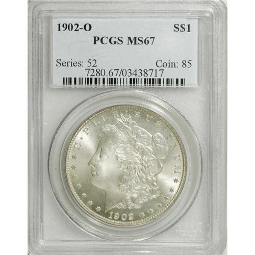 <B>1902-O S$1 MS67 PCGS.</B></I> Fully brilliant silver surfaces are accented by wispy champagne toning on both sides of this Superb Gem. The strike is typical for a New Orleans Mint dollar, with slight weakness over Liberty's ear and on the eagle's breast. Population: 5 in 67, 0 finer (2/07).<BR><I>From The Jackson Hole Collection.</B></I><BR><BR><b>Shipping:</b> Coins & Currency (<a target="_blank" href="http://www.heritageauctions.com/common/shipping.php">view shipping information</a>)