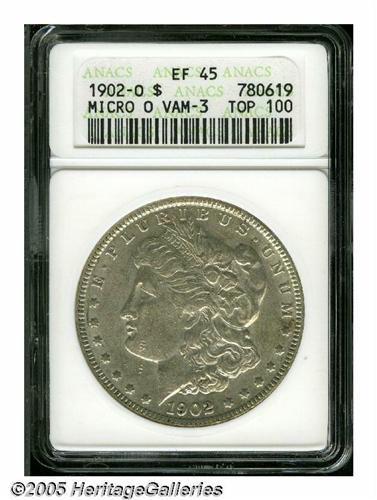 <B>1902-O<S$1> Micro O XF45 ANACS.</B></I> VAM-3, A Top 100 Variety. This variety has recently been proclaimed a contemporary counterfeit by PCGS (4/05). The current example displays a typically mushy strike and subdued, somewhat grainy surfaces. The degree of wear on the highpoints of the coin seems normal, for the assigned grade. There are a few shallow abrasions on the obverse.