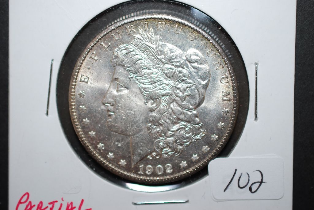 1902-O US Silver Morgan $1; AU58; Partial Toning; EST. $50-60