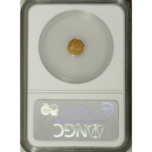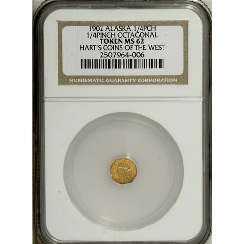 <B>1902 Octagonal 1/4 Pinch MS62 NGC.</B></I> Gould-Bressett 151. Indian head left with 13 stars. An attractive apricot-gold representative from M.E. Hart's "Coins of the West" series. These pieces were offered at the Alaska-Yukon-Pacific Exposition in 1909.<BR><BR><b>Shipping:</b> Coin/Currency (<a target="_blank" href="http://www.heritageauctions.com/common/shipping.php">view shipping information</a>)