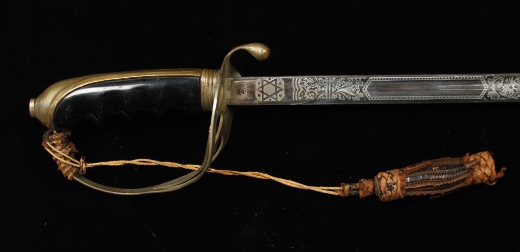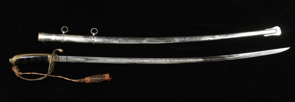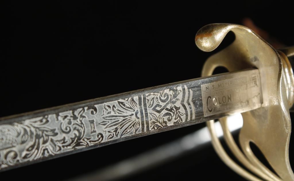 Blade etched with scrollwork design, interlocked "US", cannon's, and "Great Seal" eagle. Also etched "N.S. MEYER INC TRADE MARK COLONIA MADE IN USA". With handguard and black ergonomic grips. Decorative knot attached. Shows age with mottling of handle and blade guard. Also includes sheath which is pitted with losses to finish and small spots of minor surface rust. Saber is approx 35" overall with 29-3/4" blade. Sheath is approx 30-3/4" long.