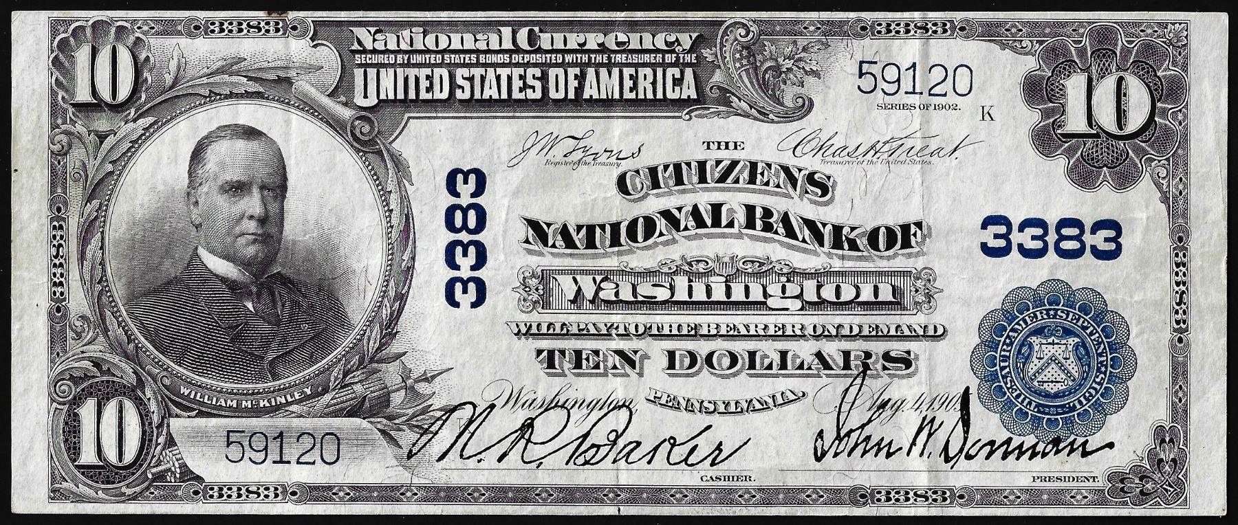 One 1902 PB $10 Citizens NB of Washington, Pennsylvania CH# 3383 National Currency Note.