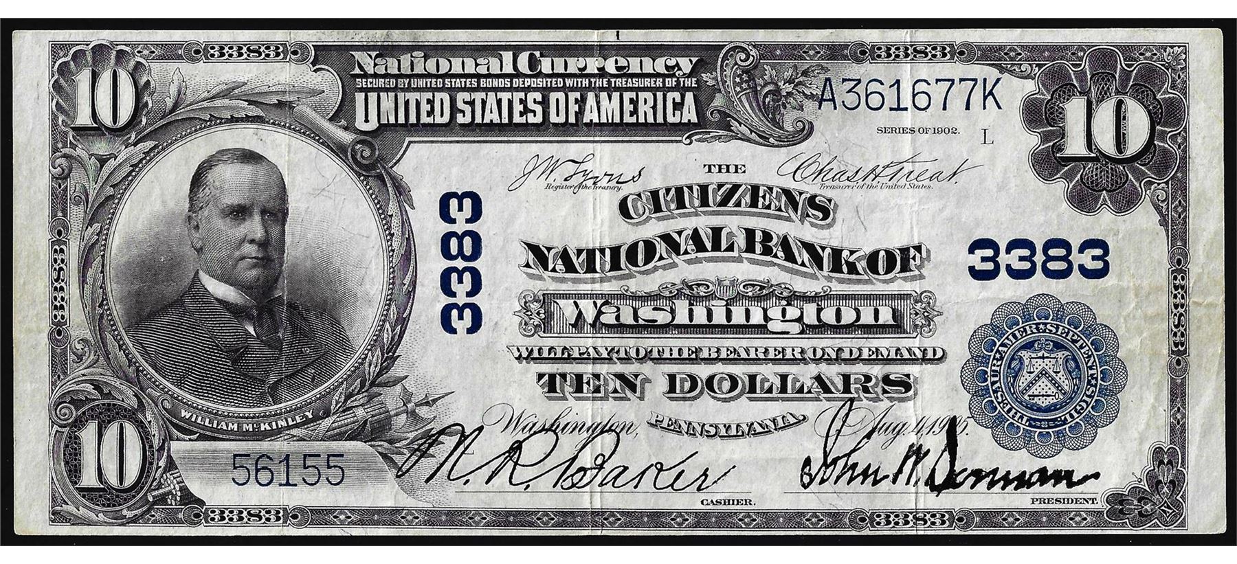 One 1902 PB $10 Citizens NB of Washington, Pennsylvania CH# 3383 National Currency Note.