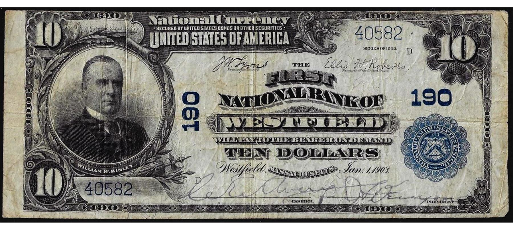 One 1902 PB $10 First NB of Westfield, MA CH# 190 National Currency Note.